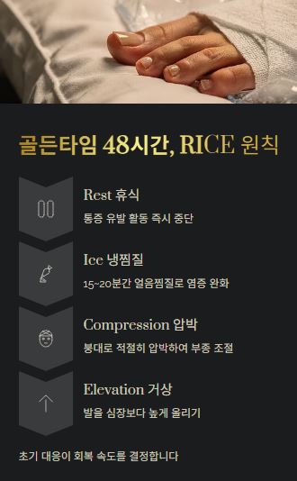 증상이 나타난 초기 48시간 내의 대응이 회복 속도를 결정합니다. 가장 기본이 되는 RICE 원칙을 기억하세요.