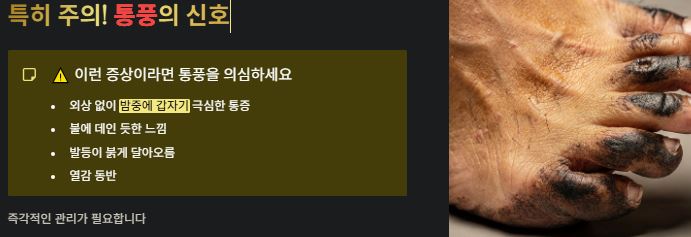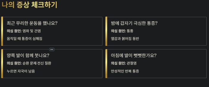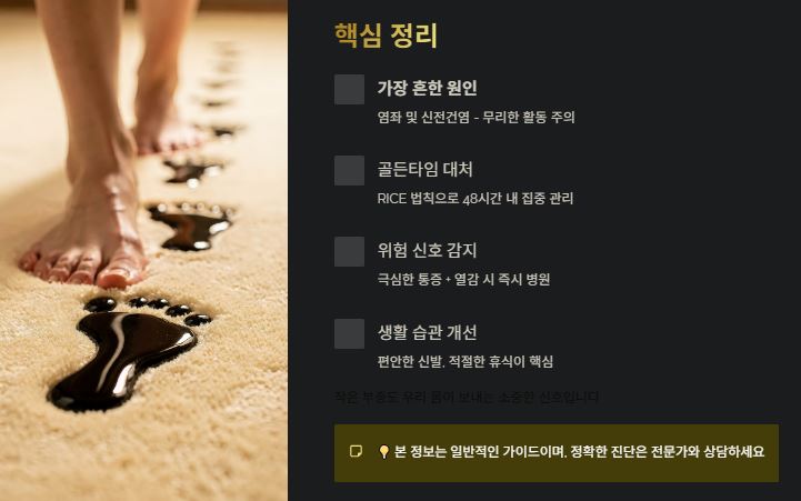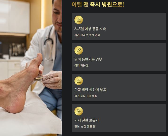 - 원인 파악: 무리한 활동 후에는 염좌를, 밤중 극심한 통증에는 통풍을 의심하세요.