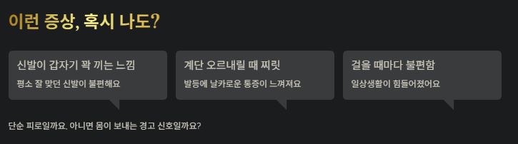 | 아침에 발이 뻣뻣한가요? | 관절염 | 만성적인 반복 통증 |