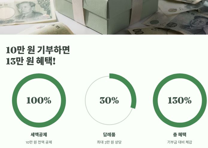 | 기부금 10만 원까지 | 전액(10만 원) 공제 | 최대 3만 원 상당 | 약 13만 원 (130%) |