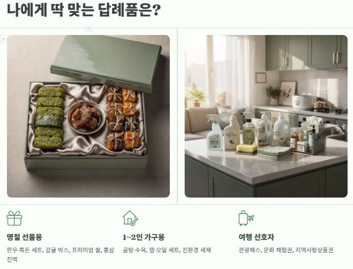 → 고급스럽고 품질이 검증된 특산물은 선물 만족도가 가장 높습니다. - 자취생 및 1~2인 가구용: 곰탕·수육 같은 간편 보존식품, 잼·오일 세트, 친환경 세제 세트