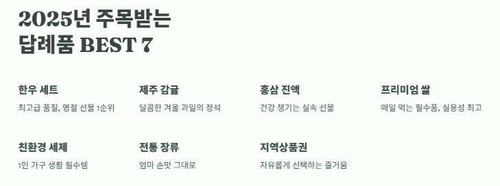 - 명절 부모님 또는 감사 선물용: 한우/흑돈 세트, 제주 감귤 박스, 프리미엄 쌀, 홍삼 진액