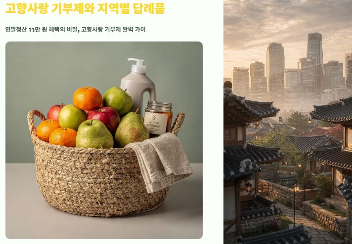 그런데 제가 요즘 가장 주목하고 있는 제도가 하나 있어요. 바로 ‘고향사랑 기부제’입니다. 이 제도는요, 단순히 기부를 넘어서 세액공제 혜택에다가 무려 지역 특산품까지 답례로 받을 수 있어서 '기부, 절세, 선물'이라는 1석 3조의 놀라운 효과를 누릴 수 있거든요.