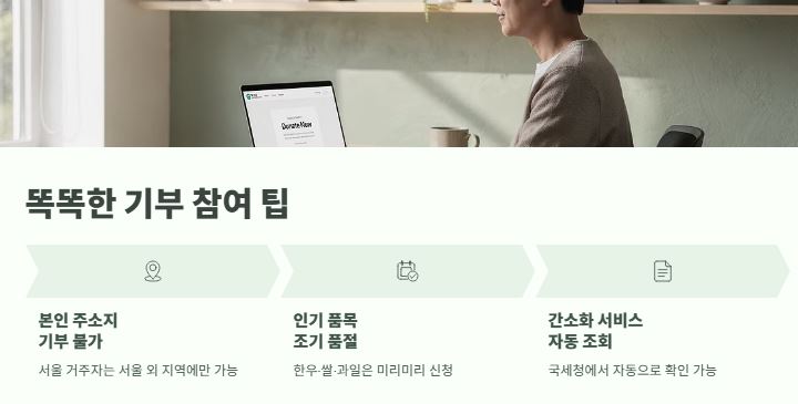 - 가장 헷갈리는 부분이죠. 예: 서울 거주자는 서울 외의 지역(인천, 제주, 경기 등)에만 기부할 수 있습니다. - 인기 답례품 품절 주의