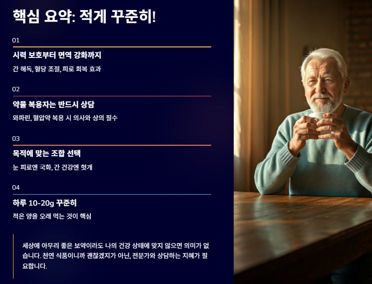 세상에 아무리 좋은 보약이라도 나의 건강 상태에 맞지 않으면 의미가 없습니다. 구기자 역시 "적게, 꾸준히" 먹는 것이 핵심이라는 점 잊지 마세요! 특히 약을 복용 중이신 분들은 '천연 식품이니까 괜찮겠지'라는 생각보다는 의사와 상담하는 지혜가 필요합니다.