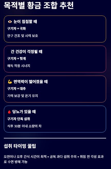 구기자는 "어떻게" 먹느냐에 따라 효과가 달라집니다. 자신의 고민에 맞는 조합을 선택해 보세요.