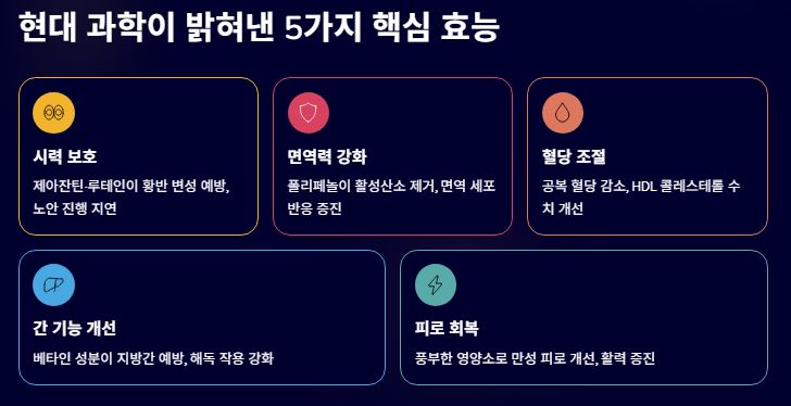 - 시력 보호 및 눈 건강: 제아잔틴과 루테인이 풍부해 황반 변성을 예방하고 노안 진행을 늦추는 데 도움을 줍니다.