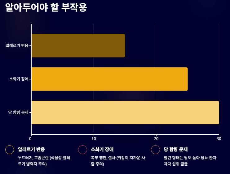 | 당 함량 문제 | 말린 과일 형태는 당도가 높으므로 당뇨 환자 과다 섭취 금물 |