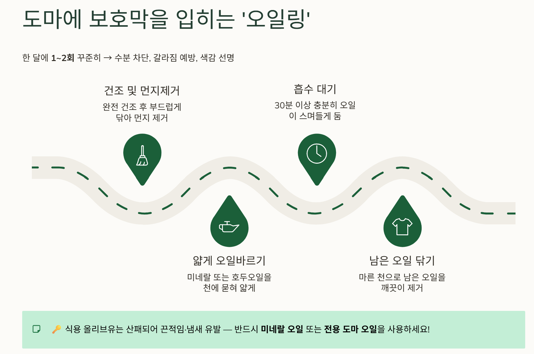 오일링은 나무의 모공을 채워 수분 침투를 막고 갈라짐을 예방하는 핵심 관리법입니다. 한 달에 1~2회 정도 꾸준히 해주면 도마의 색감도 선명해지고 훨씬 위생적으로 사용할 수 있습니다.