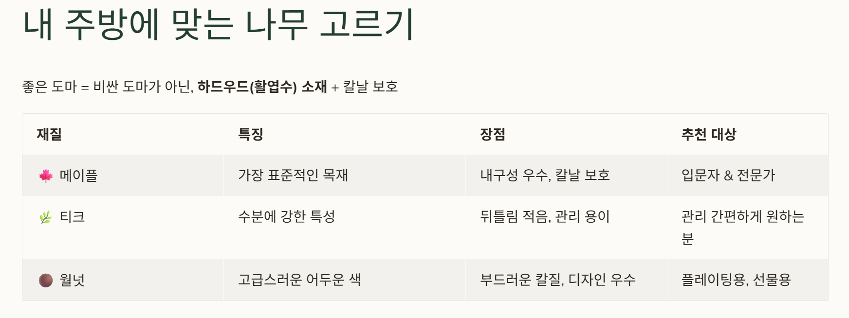 좋은 도마는 단순히 비싼 제품이 아니라, 하드우드(활엽수) 재질이면서 칼날을 잘 보호해 주는 제품입니다. 대표적인 목재별 특징을 표로 비교해 드릴게요.