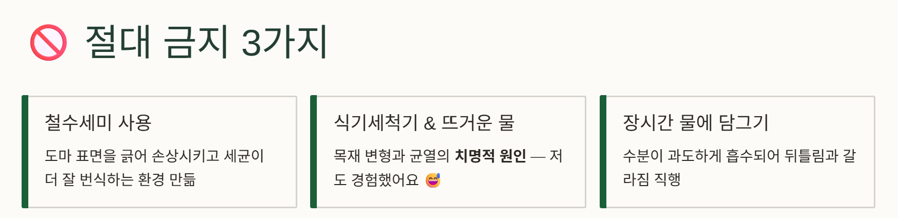 - 식기세척기 및 뜨거운 물 살균 (목재 변형 및 균열의 치명적 원인)