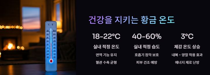 | 실내 온도 | 18~22℃ | 면역 기능 유지, 혈관 수축 균형 |