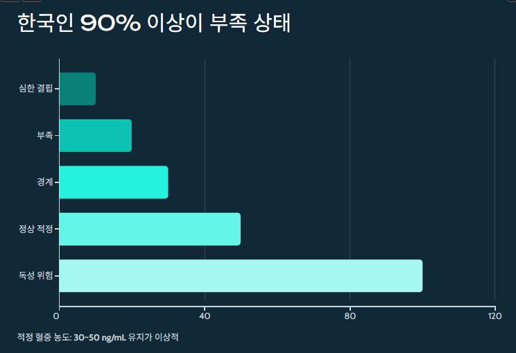 한국인의 약 90% 이상이 비타민 D 부족 상태라는 통계가 있습니다. 전문가들이 권장하는 적정 혈중 농도는 보통 30~50 ng/mL입니다. 아래 표를 통해 나의 상태를 가늠해 보세요.