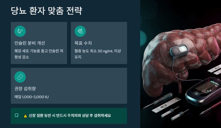 비타민 D는 췌장의 인슐린 분비 세포 기능을 돕고 인슐린 저항성을 개선하는 데 기여합니다. 당뇨가 있다면 혈중 농도를 최소 30 ng/mL 이상으로 유지하는 것이 혈당 조절에 유리합니다.