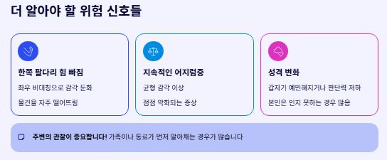 뇌가 보내는 경고 신호는 생각보다 다양합니다. 아래 리스트를 보면서 본인이나 가족의 상태를 체크해 보세요.