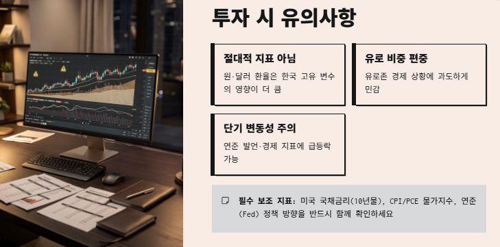 - 절대적 지표가 아님 : DXY는 원·달러 환율과 1:1로 움직이지 않습니다. 한국의 수출입 동향, 무역수지, 외국인 수급 등 한국 고유의 변수가 원·달러 환율에 훨씬 더 큰 영향을 줍니다.