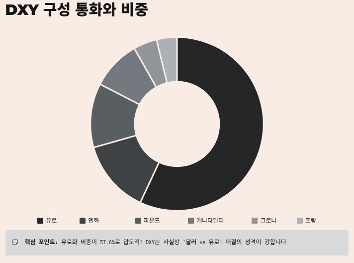 - 유로화의 압도적 비중 : DXY 움직임의 절반 이상은 유로화의 가치 변동에 의해 결정됩니다.
