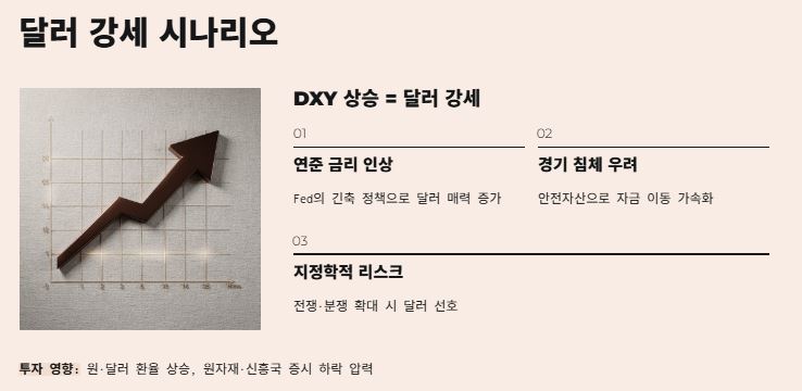 - 영향 : 원화 가치 하락으로 원·달러 환율이 상승할 가능성이 높고, 원자재 가격이나 신흥국 증시에는 부정적인 압력으로 작용합니다.