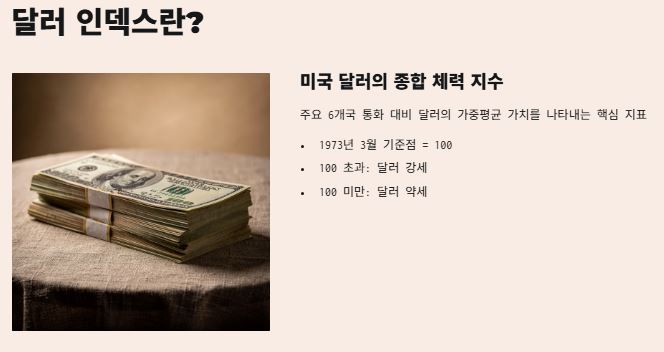 - 정의: 미국 달러(USD)의 주요 6개국 통화 대비 가중평균 가치를 나타내는 지표입니다.