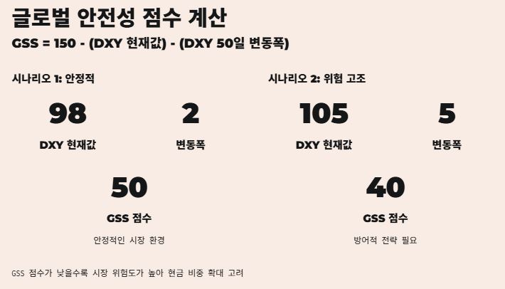 - 시나리오 2 (위험 고조): DXY 현재값 105, 50일 변동폭 52) 계산: 150 - 105 - 5 = 40점