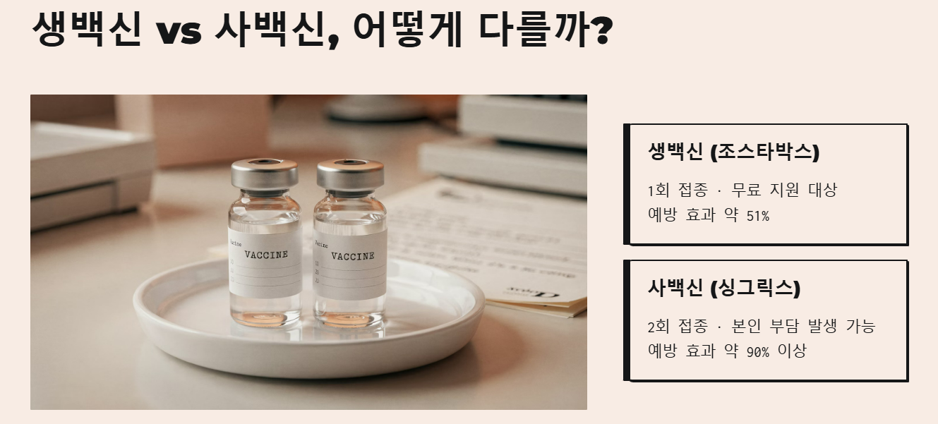 무료 접종 백신은 대부분 '생백신'인 경우가 많습니다. 최근 유행하는 고효율 '사백신(싱그릭스 등)'은 본인 부담금이 발생할 수 있으므로, 접종 전 백신 종류를 확인하세요.