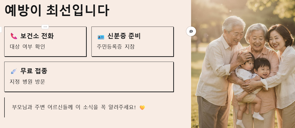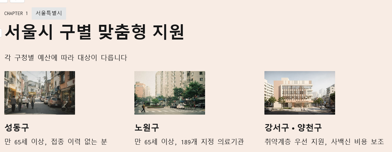 - 성동구: 만 65세 이상 주민 중 접종 이력이 없는 분들께 무료 백신을 지원합니다.