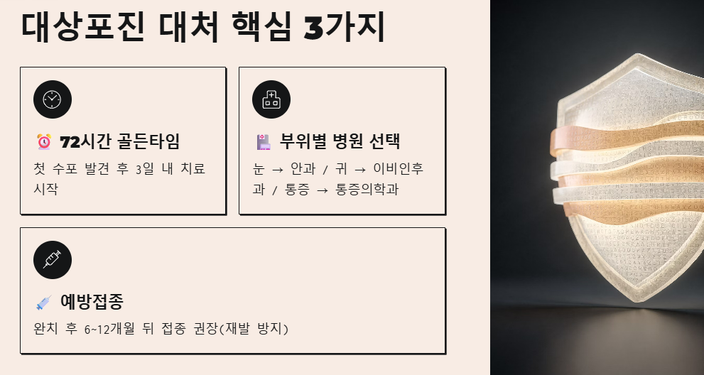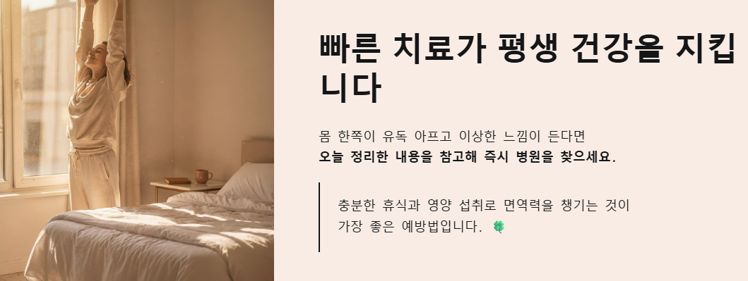 대상포진은 '얼마나 빨리 치료를 시작하느냐'가 평생 남을 수 있는 신경통을 결정합니다. 몸 한쪽이 유독 아프고 이상한 느낌이 든다면, 오늘 정리해 드린 내용을 참고해서 즉시 병원을 찾으세요! 무엇보다 평소 충분한 휴식과 영양 섭취로 면역력을 챙기는 것이 가장 좋은 예방법이라는 사실, 잊지 마세요~ 여러분 모두 건강한 하루 보내시길 바랍니다!