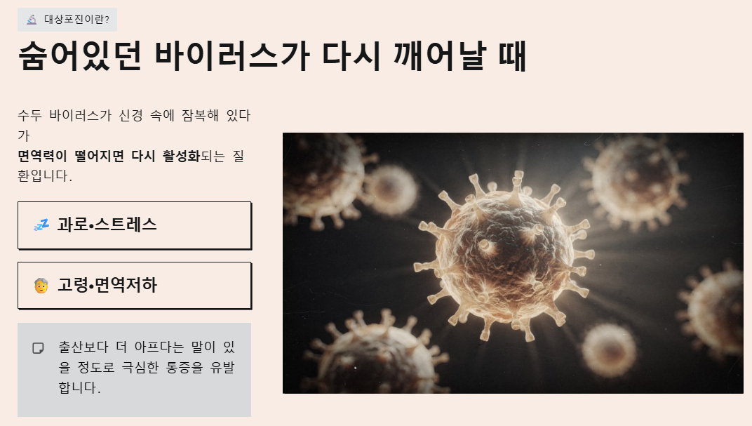 피부 발진보다 '통증'이 훨씬 심하거나, 피부가 다 나았는데도 통증이 지속된다면 전문적인 신경 치료가 필요합니다.
