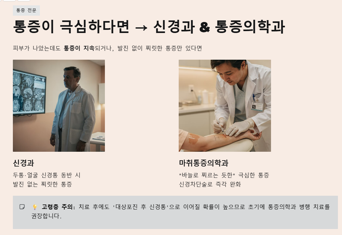 - 신경과: 두통이나 얼굴 신경통이 동반될 때, 혹은 발진이 없는데 찌릿찌릿한 통증만 있을 때 방문합니다.