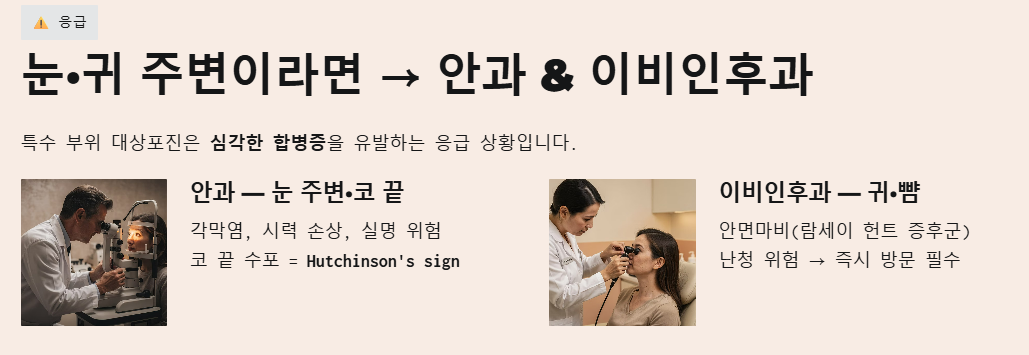 - 눈 주위나 코 끝에 물집이 생겼다면? → 안과 (실명 예방 응급 진료)