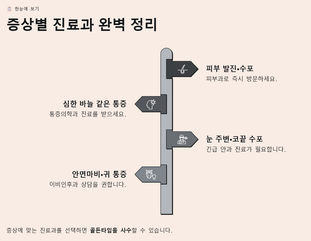 - 안면 마비나 귀 통증이 느껴진다면? → 이비인후과 (람세이 헌트 증후군 치료)