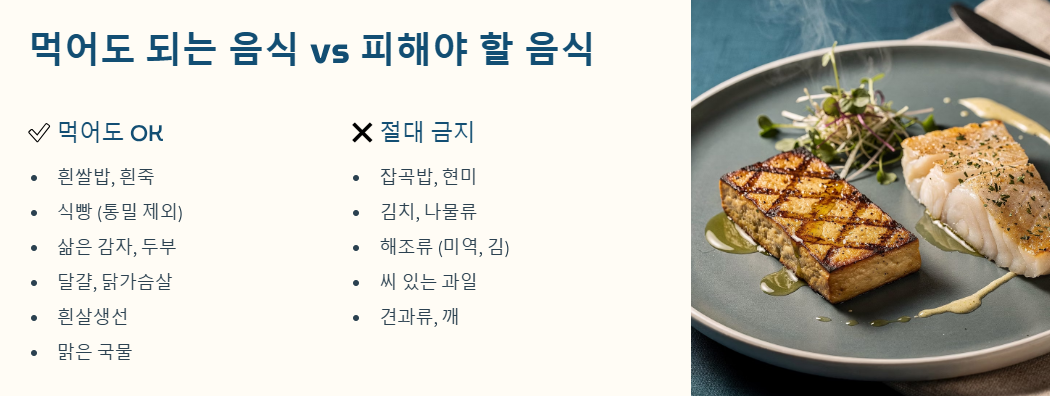흰쌀밥, 흰죽, 식빵(통밀 제외), 삶은 감자, 두부, 달걀, 닭가슴살, 흰살생선, 맑은 국물