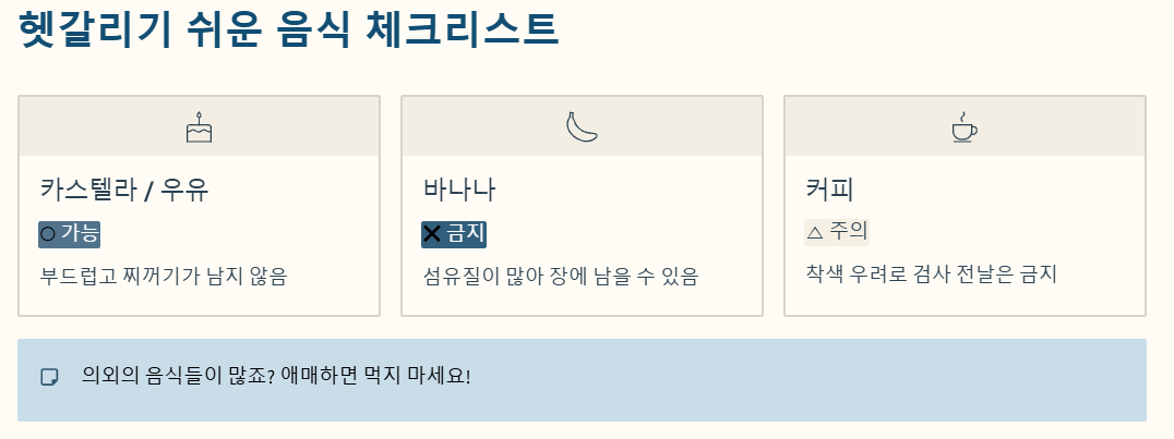| 커피(아메리카노) | △ 주의 | 착색 우려로 검사 전날은 금지 |