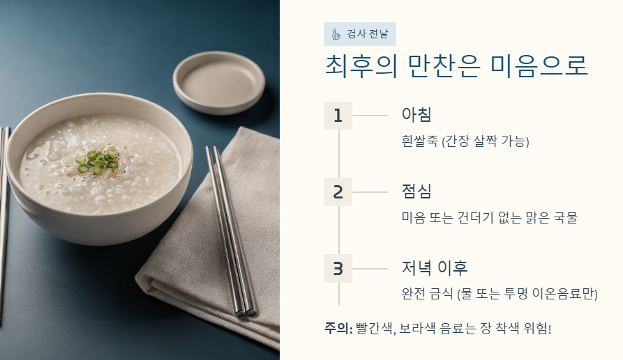 검사 전날은 가장 힘든 날입니다. 보통 아침과 점심은 '흰 죽 또는 미음'으로 가볍게 드시고, 저녁부터는 본격적인 금식에 들어가야 해요. 투명한 이온음료는 탈수 예방에 도움이 되니 곁들여 마셔주면 좋습니다. 단, 빨간색이나 보라색 음료는 장을 착색시킬 수 있으니 절대 피하세요!