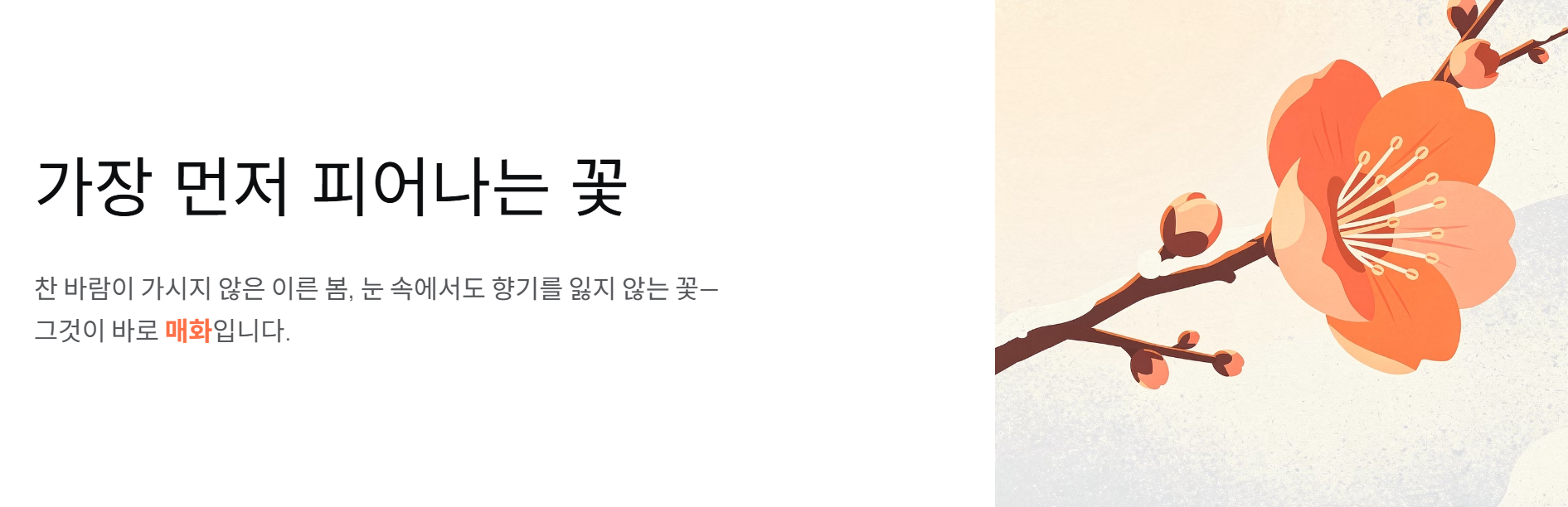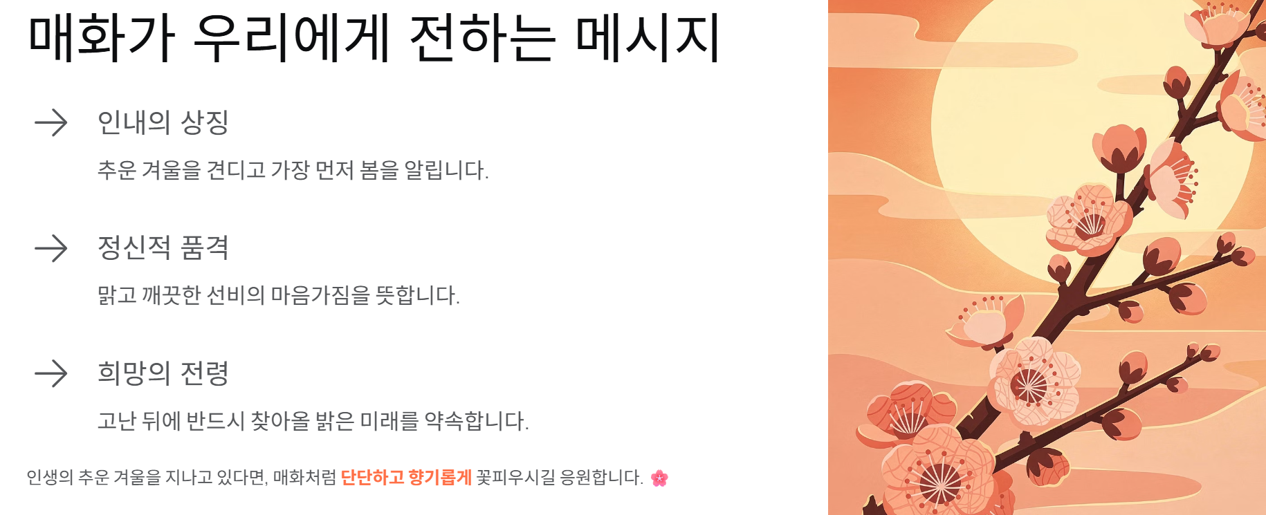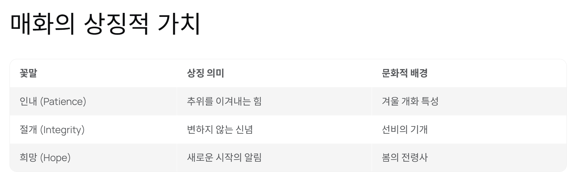 매화는 겨울 끝자락(2~3월)에 피어나기 때문에 '희망'이라는 꽃말도 가지고 있습니다. 고난 끝에 반드시 찾아오는 봄을 상징하기 때문이죠.