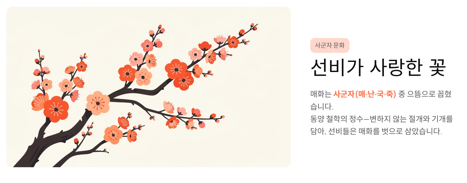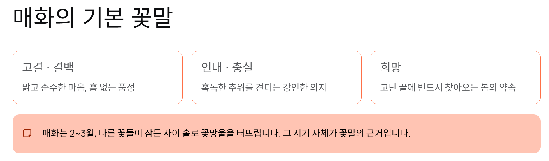 매화의 꽃말은 단순한 수식어가 아니라 동양 철학의 정수가 담겨 있습니다. 특히 '사군자(매·난·국·죽)' 중 으뜸으로 꼽히며 선비들의 사랑을 듬뿍 받았답니다.