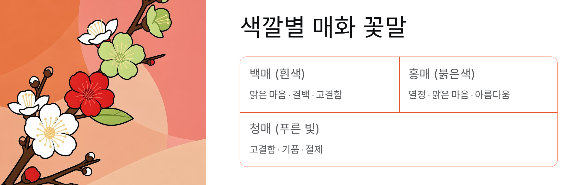 - 홍매(붉은색): 열정, 맑은 마음, 아름다움