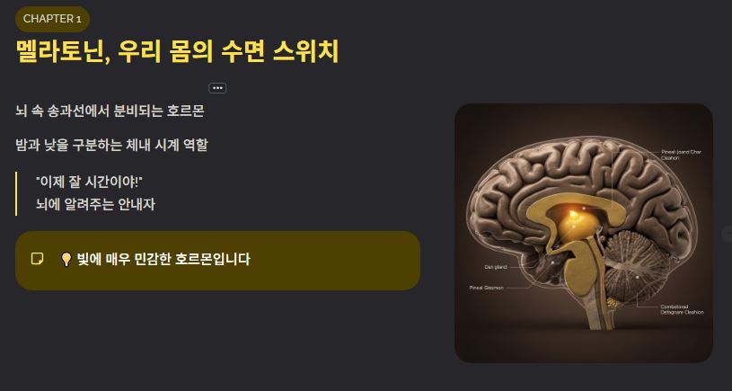 - 멜라토닌은 가이드다: 수면제처럼 강제로 재우는 게 아니라 잘 환경을 조성해주는 호르몬입니다.