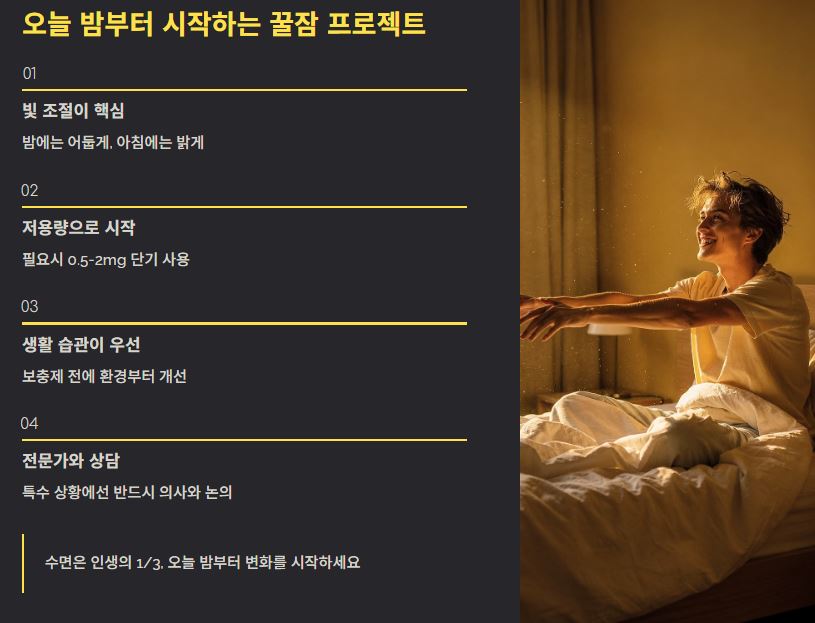 보충제에 의존하기 전에 우리 몸이 스스로 멜라토닌을 잘 만들어내도록 환경을 조성해주는 것이 훨씬 중요합니다. 제가 효과를 톡톡히 본 방법들을 공유할게요!