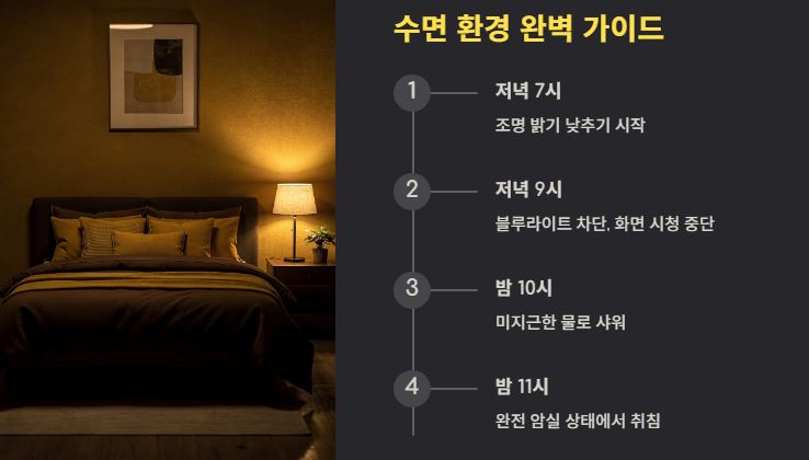 - 침실은 완전 암실로: 작은 무드등조차 멜라토닌 생성을 방해할 수 있어요. 안대를 활용해 보세요.