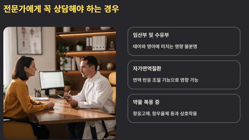 - 전문가 상담 필수: 임산부나 자가면역질환이 있다면 반드시 의사와 상의해야 합니다.