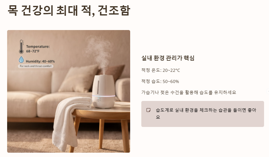 목 간질거림의 가장 큰 적은 건조함입니다! 현재 실내 온도를 입력하면 목 건강을 위한 최적의 목표 습도를 알려드릴게요.