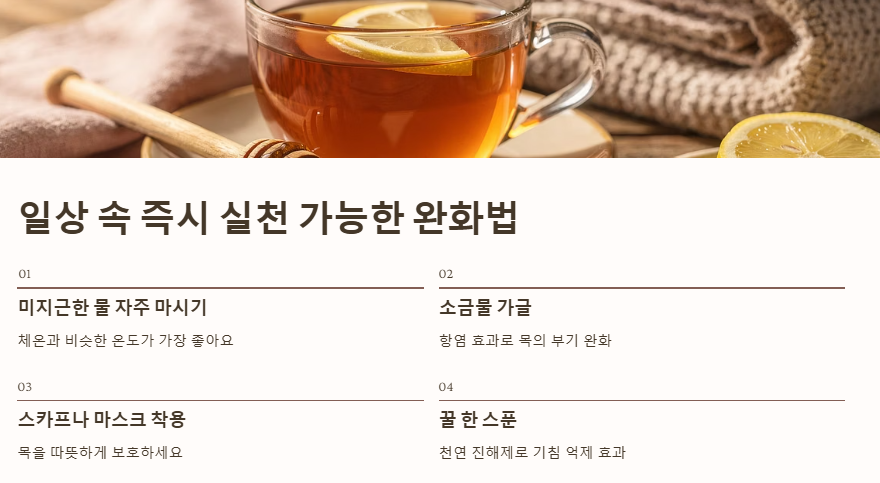 - 미지근한 물 자주 마시기: 찬물은 점막을 자극할 수 있으니 체온과 비슷한 온도의 물이 가장 좋습니다.