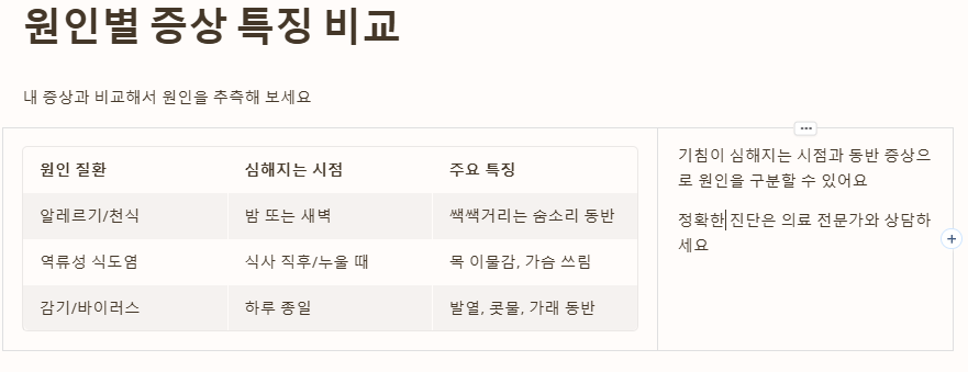 내가 왜 기침을 하는지 헷갈린다면 아래 표를 통해 나의 증상과 비교해 보세요. 원인에 따라 기침이 심해지는 시점과 동반 증상이 다릅니다.