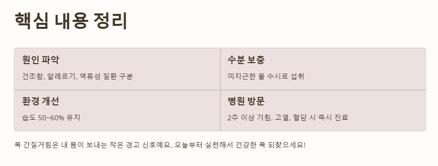 목이 간질거리는 증상은 내 몸이 보내는 작은 경고 신호일 수 있어요. 오늘 알려드린 방법들로 목 건강 잘 챙기시고, 더 궁금한 점이 있다면 언제든 댓글로 남겨주세요! 건강한 하루 보내시길 바랍니다~