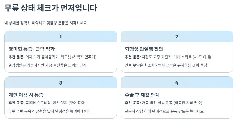 무릎 운동은 '무엇을 하느냐'보다 '내 상태가 어떠냐'가 훨씬 중요해요. 상태에 따라 오히려 독이 될 수도 있거든요. 현재 본인의 증상에 맞춰 운동 목적을 설정해 보세요.