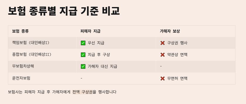 | 가해자 책임보험(대인배상 I) | ✅ (우선 지급) | ❌ (피해자 지급 후 구상) |