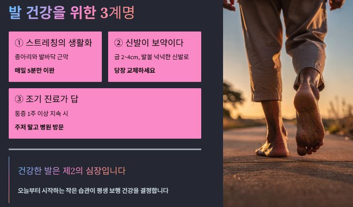 발 건강 관리의 핵심은 "참지 않는 것"입니다. 오늘 배운 내용을 세 줄로 요약해 드립니다.