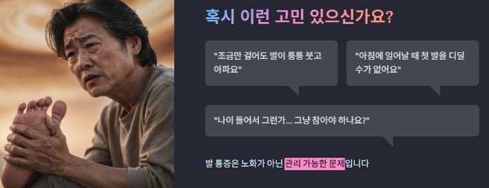"나이가 들어서 그런가, 조금만 걸어도 발이 퉁퉁 붓고 아프네..." 혹시 이런 생각을 하며 통증을 그냥 참고 계시진 않나요? 사실 중장년층의 발 통증은 노화 때문만은 아닙니다. 잘못된 신발 선택이나 굳어진 근막이 원인인 경우가 많거든요.