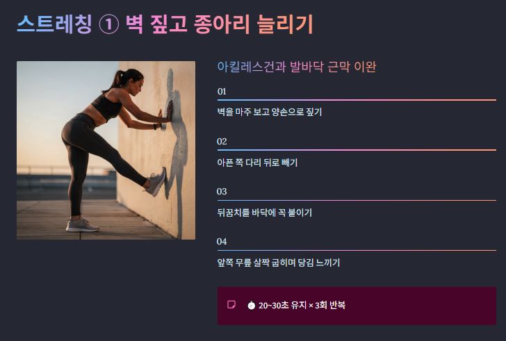 - 스트레칭의 생활화: 종아리와 발바닥 근막을 매일 5분만 이완시켜 주세요.